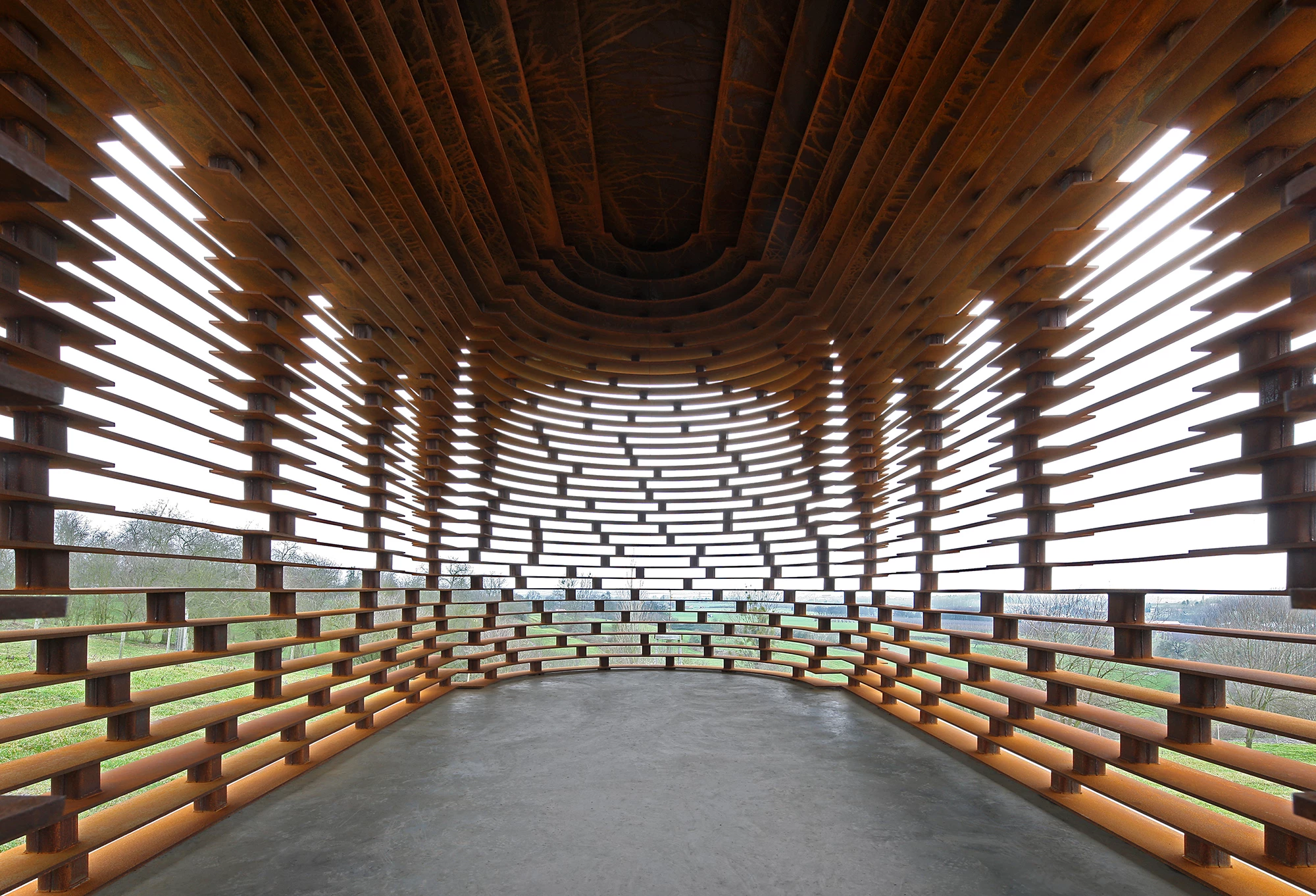 Al recorrerla, las aberturas entre las placas funcionan como marcos que enmarcan huertos, colinas y horizontes amplios. La luz transforma el interior durante el día, creando una experiencia que combina peso material y presencia visual ligera. Cada ángulo ofrece una percepción distinta, lo que convierte el sitio en uno de los puntos fotográficos más buscados de Bélgica.