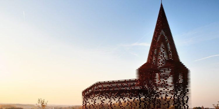 En la región de Limburgo, en Bélgica, se alza Reading Between the Lines, una obra que reinterpreta la figura de una iglesia rural a través de un lenguaje completamente contemporáneo. Creada por los artistas belgas Pieterjan Gijs y Arnout Van Vaerenbergh, la pieza utiliza la silueta clásica de un templo europeo como base para una estructura abierta, formada por láminas horizontales de acero que integran el paisaje en cada dirección.